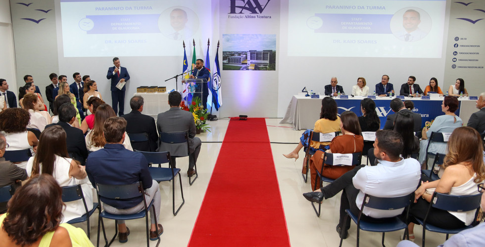 A mesa de honra foi composta pelo Presidente da FAV, Prof. Dr. Marcelo Ventura; o Vice-presidente, Dr. Marcelo Ventura Filho; a Presidente do Conselho Curador, Profª. Dra. Liana Ventura; O Vice-Presidente do Conselho Curador da FAV, Dr. Ronald Cavalcanti; a Coordenadora do Departamento de Investigação Científica, Profª. Dra. Camila Ventura e o Paraninfo da turma, Dr. Kaio Soares. A solenidade contou com a presença de membros da Diretoria da Fundação, o Diretor Executivo da FAV, Dr. Rogério Freitas; o Diretor Médico Administrativo, Dr. Edson Nakahara e o Vice-diretor Médico Administrativo, Dr. Kayo Espósito. Também estiveram presentes, familiares, amigos e colaboradores da Fundação.